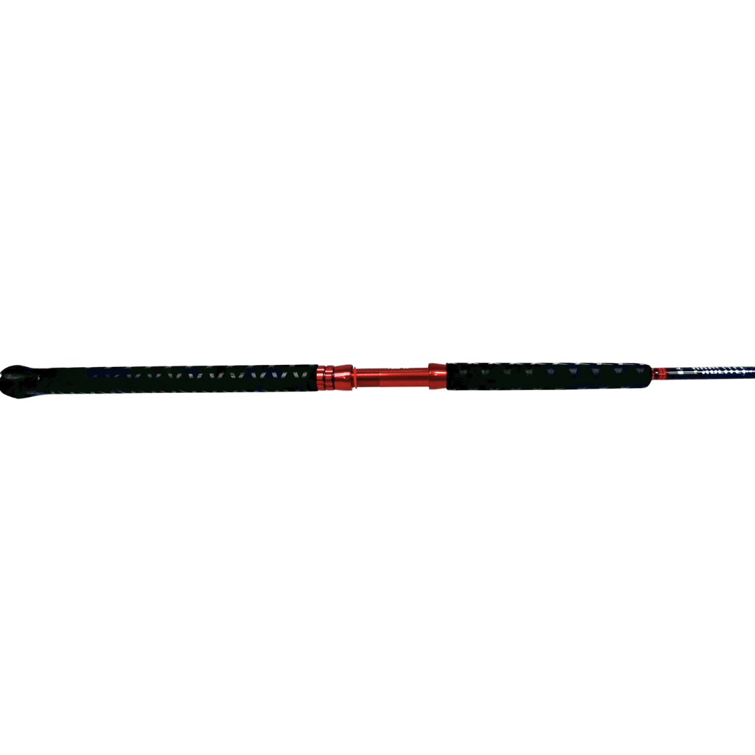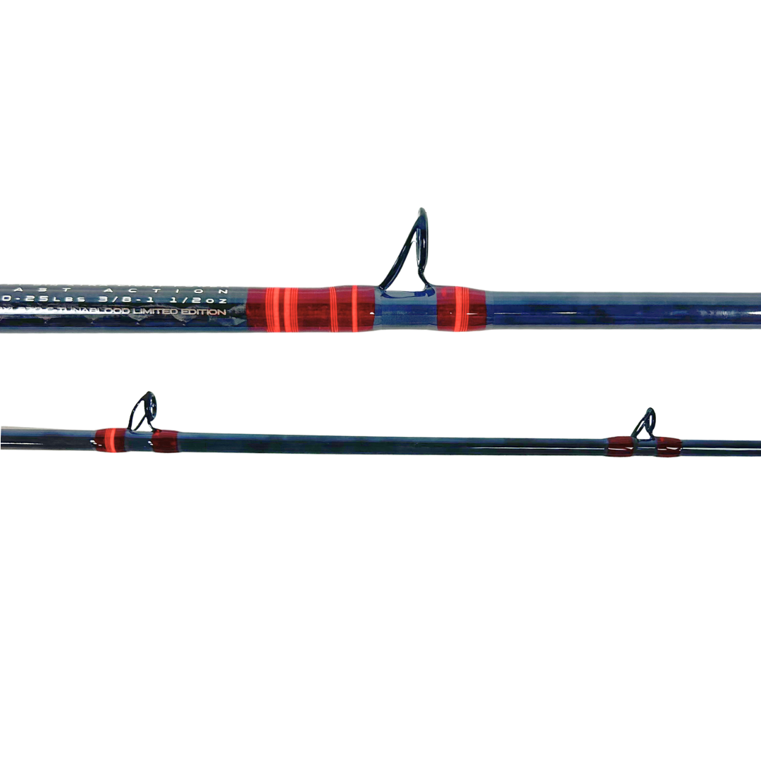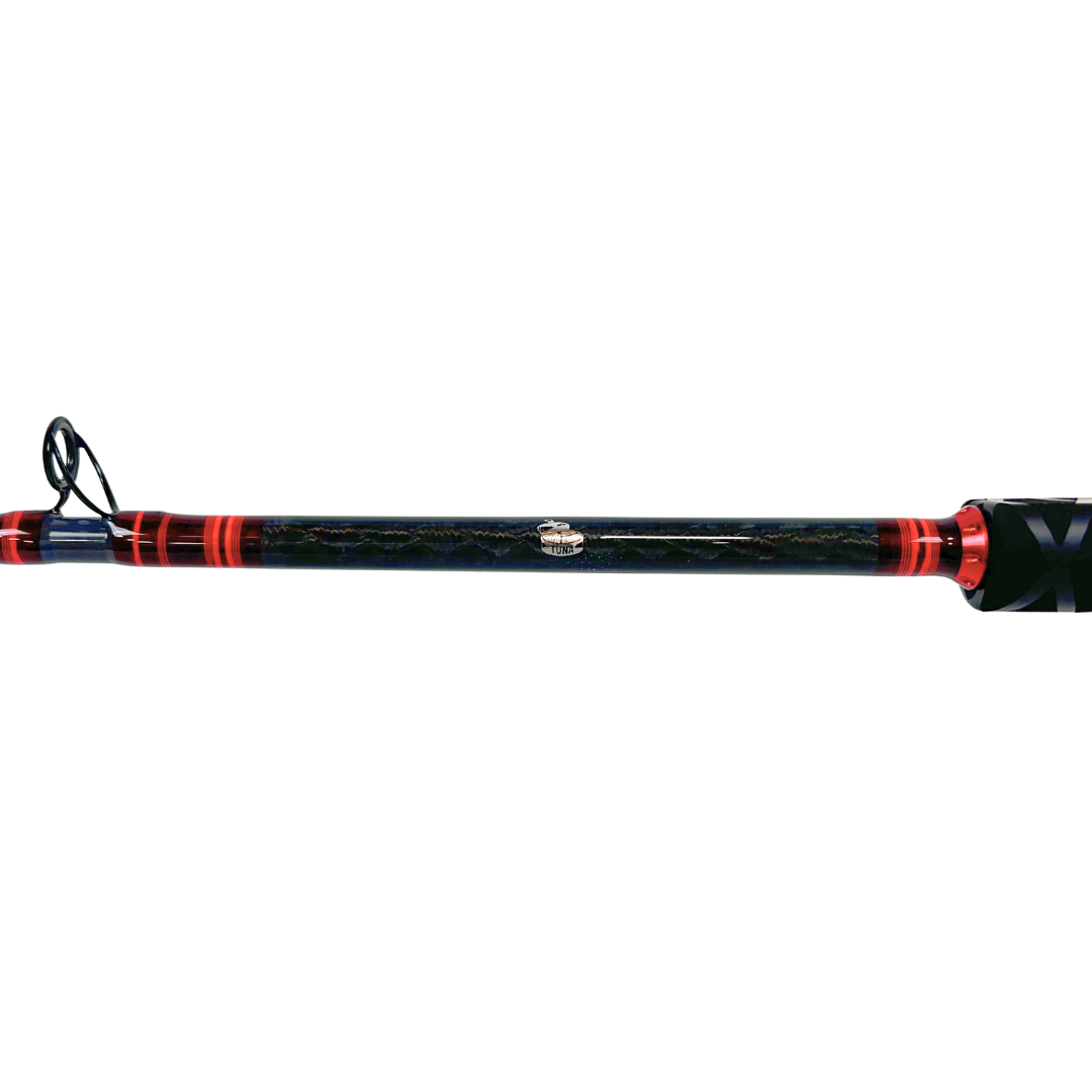Introducing “Tuna Blood” — a 7'0" Carbon X live bait tuna rod that bleeds precision and power. Designed by our builder Porter, this rod features an xtra light power rating and fast action, perfect for pitching baits with finesse while keeping the backbone to handle the heat of a tuna fight. Built with a flat top foregrip for solid leverage and topped with deep blood-red accents over dark carbon, this rod doesn’t just perform — it makes a statement. With a line rating of 10-25 lbs and a bold, battle-ready look, the Tuna Blood is built for serious action and those who fish with grit.