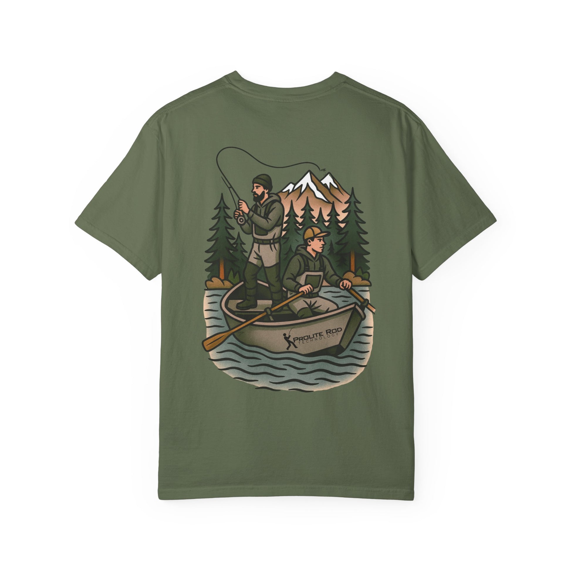 A soft, heavyweight garment-dyed tee that feels lived-in from the first wear. The front carries a small, understated logo over the heart; the back opens into a warm, illustrated scene of two anglers rowing a boat against a pine-lined mountain backdrop. Wear it for quiet mornings on the water, slow drives to the cabin, or evenings around a camp stove — it settles into your routine and keeps its color and shape wash after wash. The relaxed fit and pre-shrunk ring-spun cotton give breathable comfort, while the tubular knit and double-needle stitching promise durability. Available in many washed shades, this tee blends outdoor nostalgia with everyday ease.