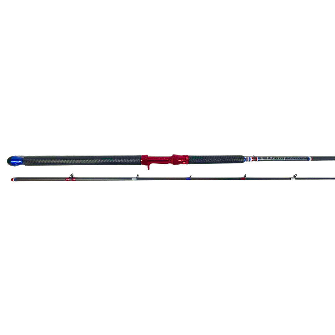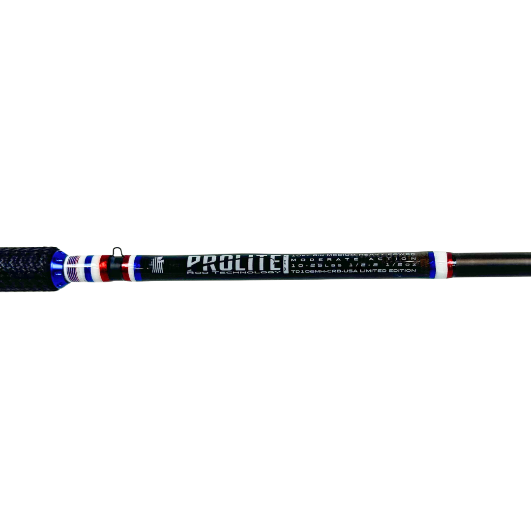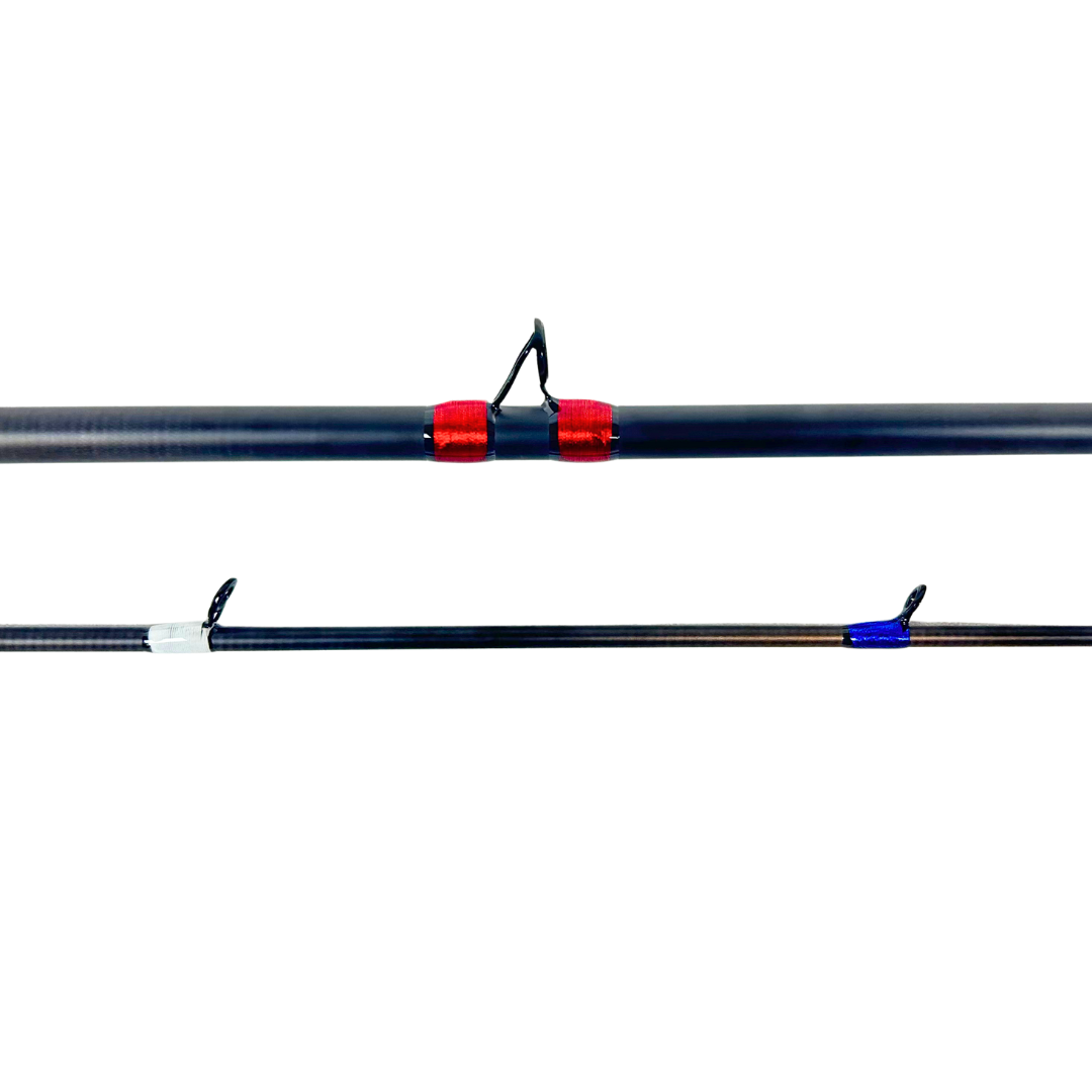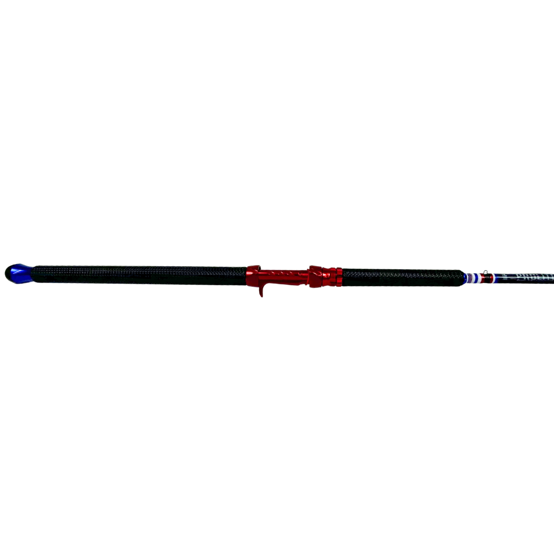This takedown 10'6" casting-style rod is a bold tribute to American grit and craftsmanship. Built with a medium heavy power and a 10–25 lb line rating, it delivers the strength and responsiveness needed for targeting hard-fighting fish. Outfitted with durable bulletproof grips, a red anodized aluminum reel seat, and a deep blue aluminum buttcap, it’s built to turn heads and take a beating. Wrapped in a striking red, white, and blue thread scheme, this rod proudly showcases its patriotic roots. Designed by Porter, one of our talented builders, it reflects his attention to detail and creative vision. Whether you’re working the river or saluting the stars, this rod is ready to put in the work and stand out doing it.