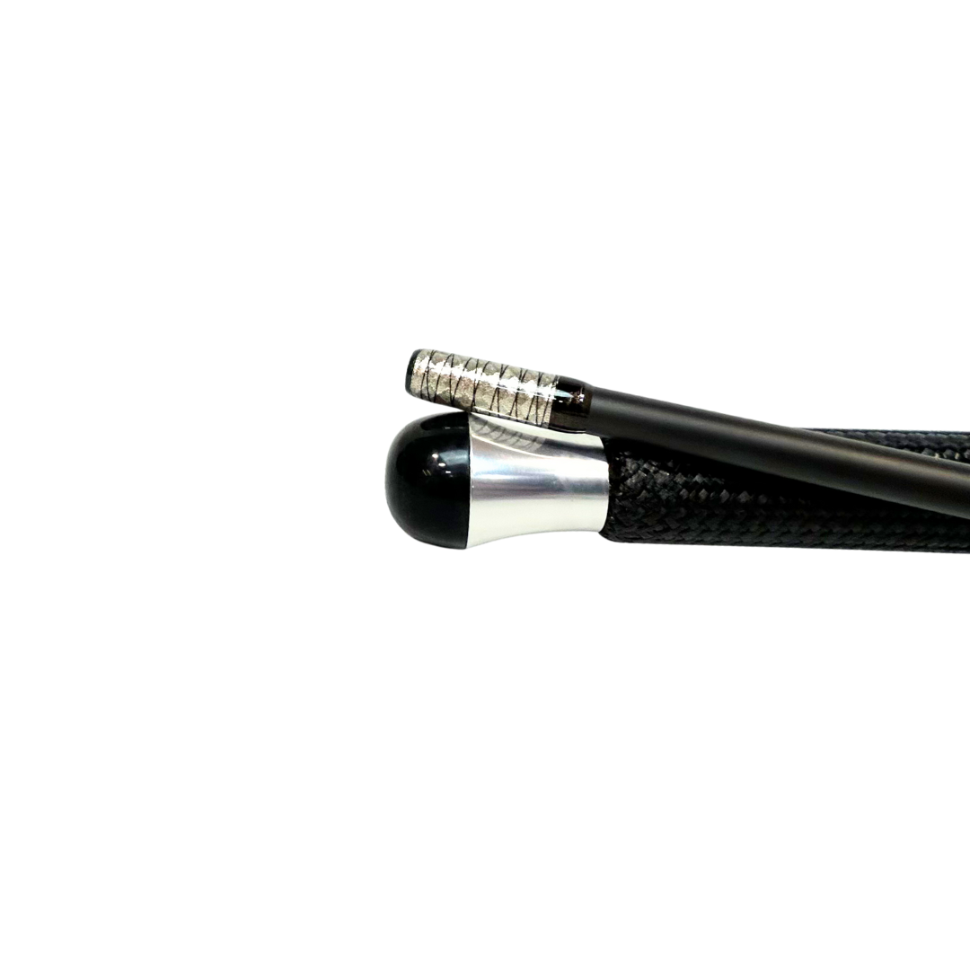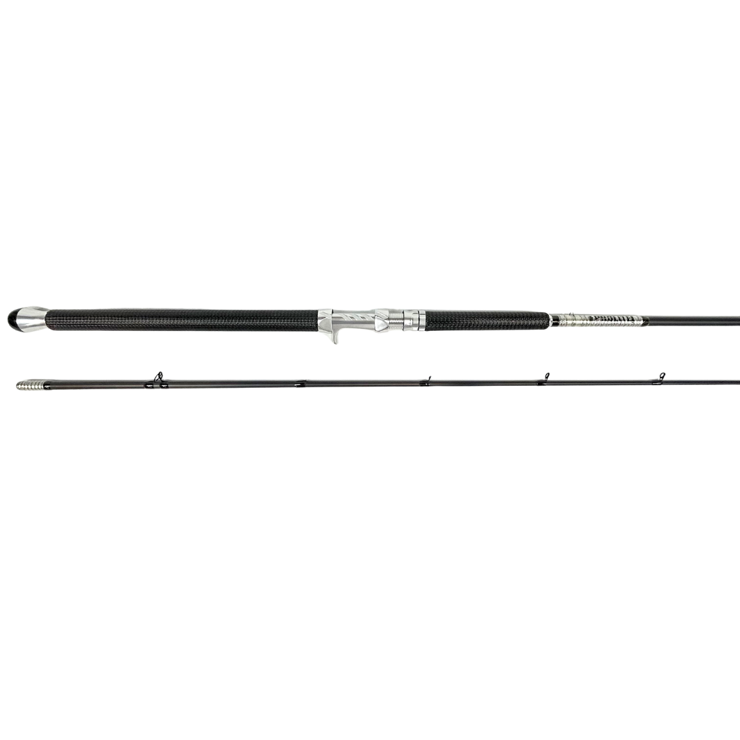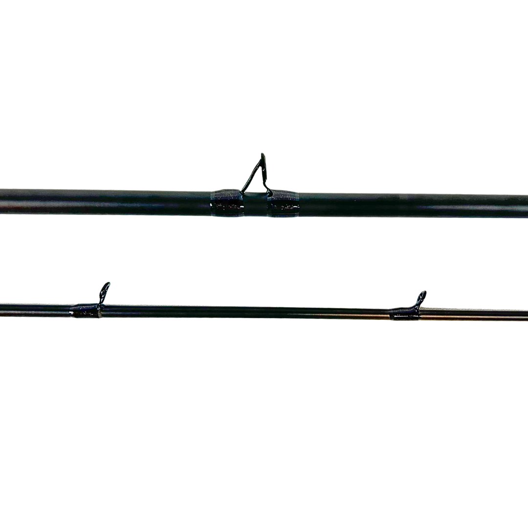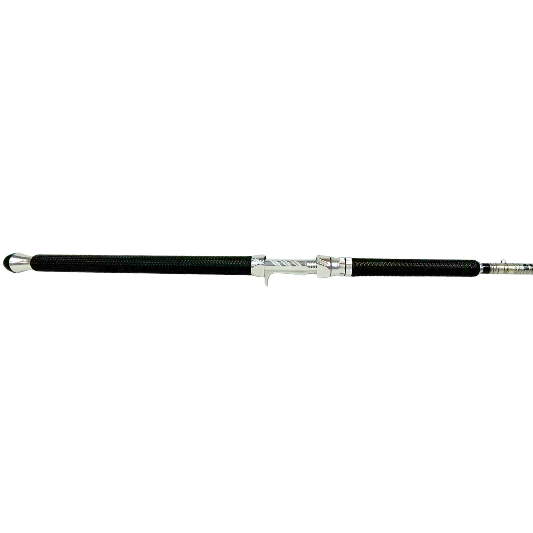 This 10'6" Takedown casting rod is a striking fusion of cutting-edge materials and custom artistry, built on a medium heavy power blank that delivers the perfect blend of strength and responsive action for serious downrigger and trolling applications. Designed and meticulously crafted by our new rod builder Porter, this rod features an impressive silver and titanium grey dragon scale wrap near the handle that adds sophisticated depth and a refined, almost armored look. The guides are wrapped in a sleek titanium grey metallic thread, creating a seamless, modern aesthetic that flows effortlessly along the blank. Engineered for both durability and performance, it sports bulletproof carbon fiber grips — a 12-inch rear grip and a 6-inch foregrip — offering superior toughness and a lightweight, ergonomic feel that stands up to long days on the water. Finished with polished hardware and Porter’s keen attention to detail, this rod isn’t just built to fish — it’s built to make a statement. As one of Porter’s first design pieces, it combines fresh enthusiasm with Prolite’s commitment to quality, ensuring you have a rod that looks as bold as it performs.