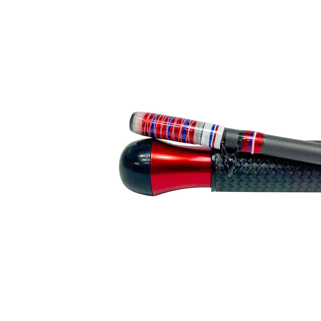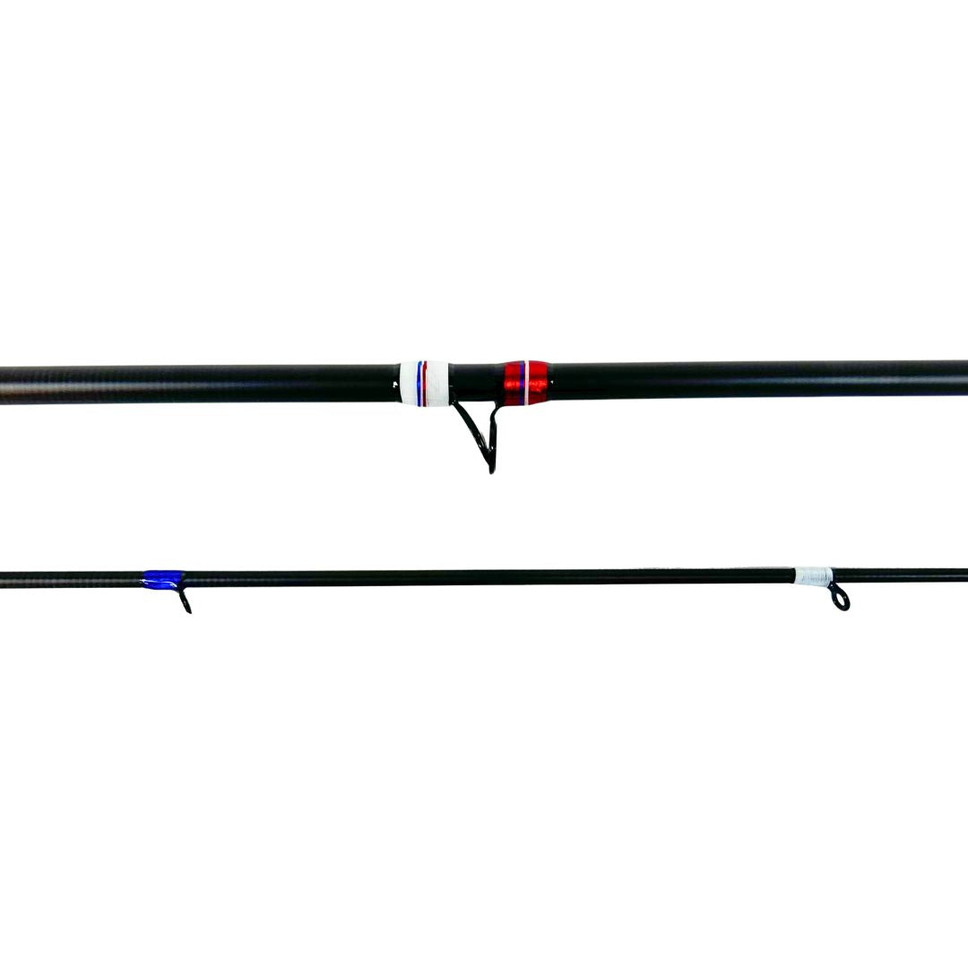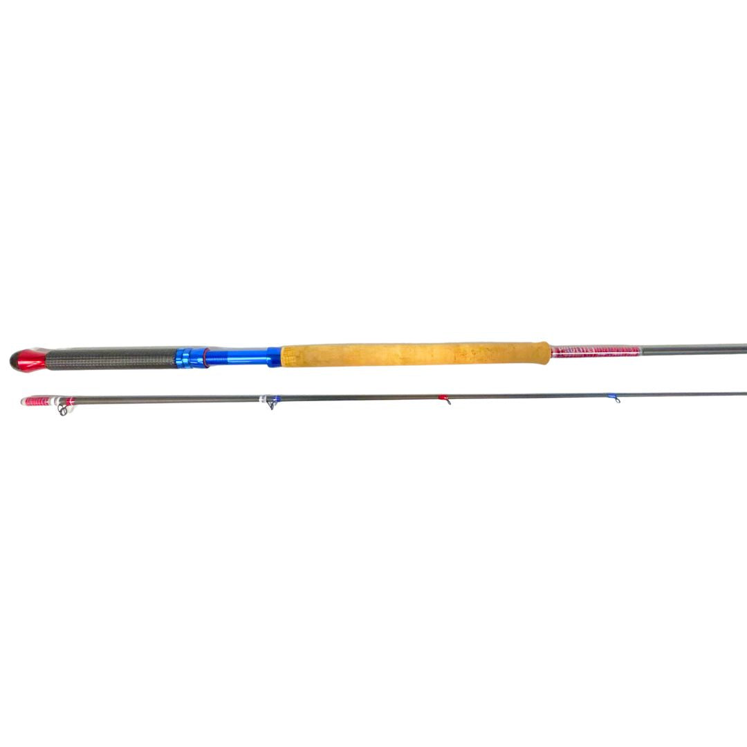 This 10'6" takedown NW style rod isn’t just a fishing rod — it’s a freedom flag on the water. Designed by our builder Porter, this medium power, moderate action rod is rated for 10–20 lb line and made for anglers who want to catch fish and look patriotic doing it. From the cork and carbon handle to the red, white, and blue threadwork and anodized aluminum components, this rod screams ’Merica. Just imagine hooking into your personal best chinook as an eagle soars overhead and fireworks burst behind you — that’s the energy this rod brings. Built to perform and built to stand out. USA all the way.