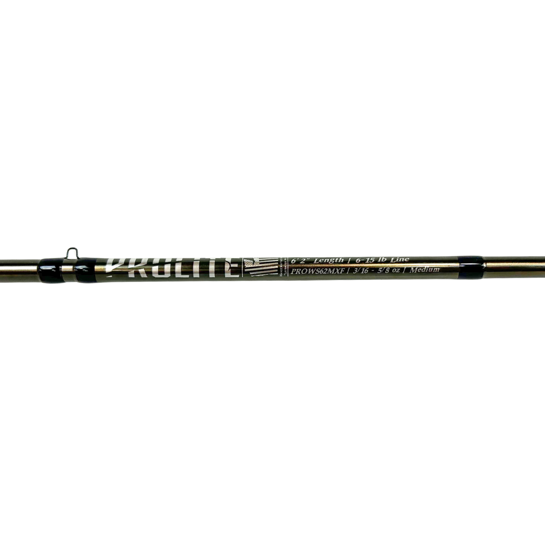 The Prolite Walleye 6'2" spinning rod with medium power, extra-fast action, and a 6–15 lb line rating is built for anglers who demand unmatched sensitivity and lightning-quick hooksets. Tailored for vertical jigging and precision casting, this rod excels at transmitting every bottom bump and light tap straight to your hand. The extra-fast tip loads effortlessly while transitioning quickly into solid backbone strength—perfect for driving hooks home on light-biting walleye. Finished with a sleek matte blank, black guide wraps, and a carbon fiber-textured grip, this rod pairs finesse with durability for serious performance in tight quarters or open water.